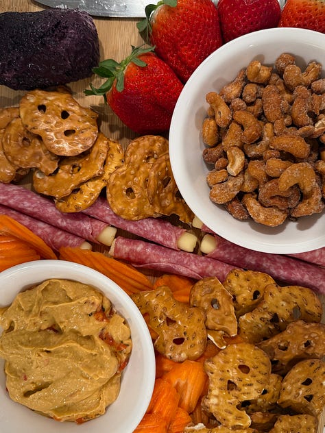 These days, I usually prefer to stay in an Airbnb over a hotel. My mom and I landed in the rain this weekend, so before we even checked in, we went straight to the grocery store. We spent our first night catching up over snacks. Our board included cheese and crackers, specifically vanilla-blueberry goat cheese and Ritz crackers. Salami Mozzarella rolls, hummus and pretzel thins, strawberries, bananas and personal pizza supplies.